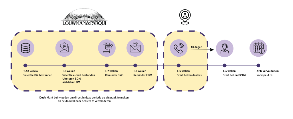 Het KKP-programma heeft als doel klanten voor onderhoud en APK naar de dealerwerkplaats te krijgen en hen loyaal te houden. Klanten krijgen servicemeldingen over de aankomende APK-vervaldatum en gepland onderhoud. Afhankelijk van het aantal gereden kilometers per jaar wordt bepaald of een klant één keer per jaar of vaker voor onderhoud moet komen. De timing en de gebruikte communicatiekanalen zijn als volgt: